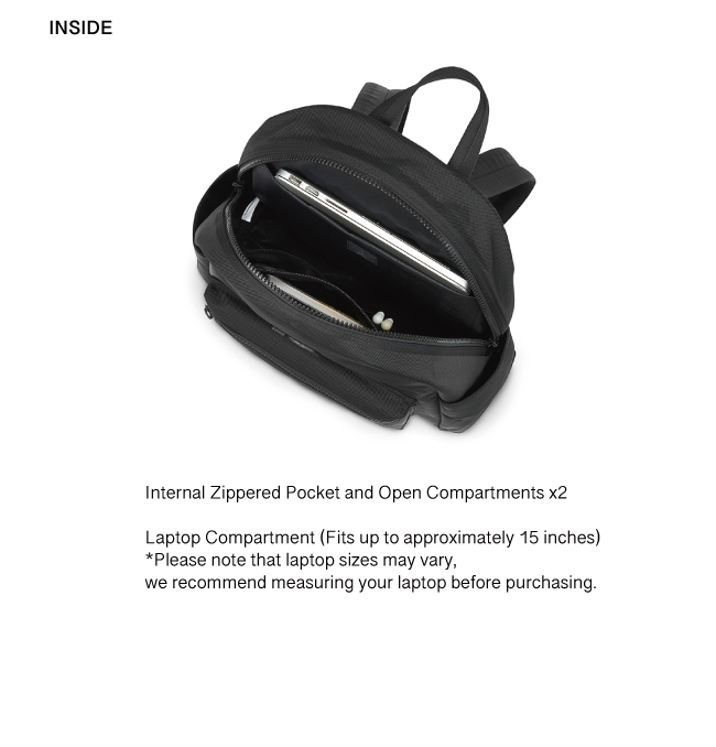 • Laptop Compartment (Fits up to approximately 15 inches) *Please note that laptop sizes may vary, we recommend measuring your laptop before purchasing.