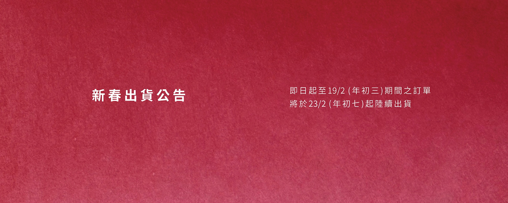 由於農曆新年連假關係, 網購出貨將稍為延遲, 於23/2(年初七)起陸續出貨. 不便之處, 敬請原諒.