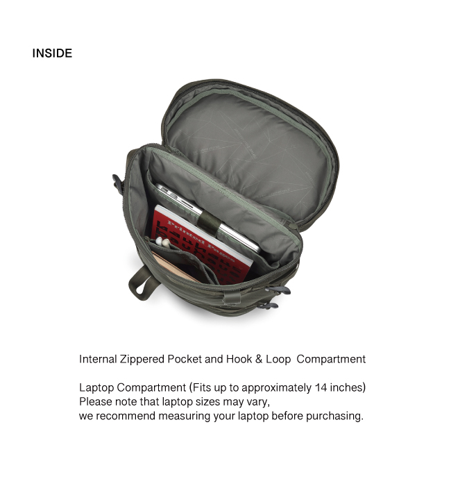Laptop Compartment (Fits up to approximately 14 inches) *Please note that laptop sizes may vary, we recommend measuring your laptop before purchasing.